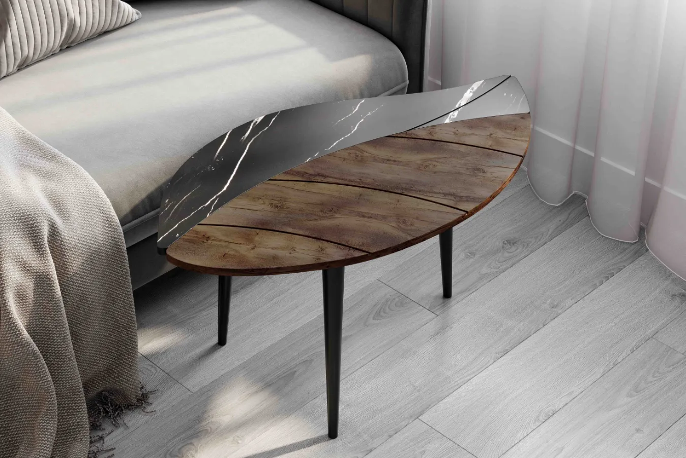 Для современных помещений в стиле “хай-тек” или “минимализм” подойдут столики из МДФ, металла, стекла и даже пластика. Очень необычно и интересно выглядят деревянные столы со вставками из эпоксидной смолы. В классическом интерьере будут лучше смотреться натуральная древесина, камень, керамогранит.