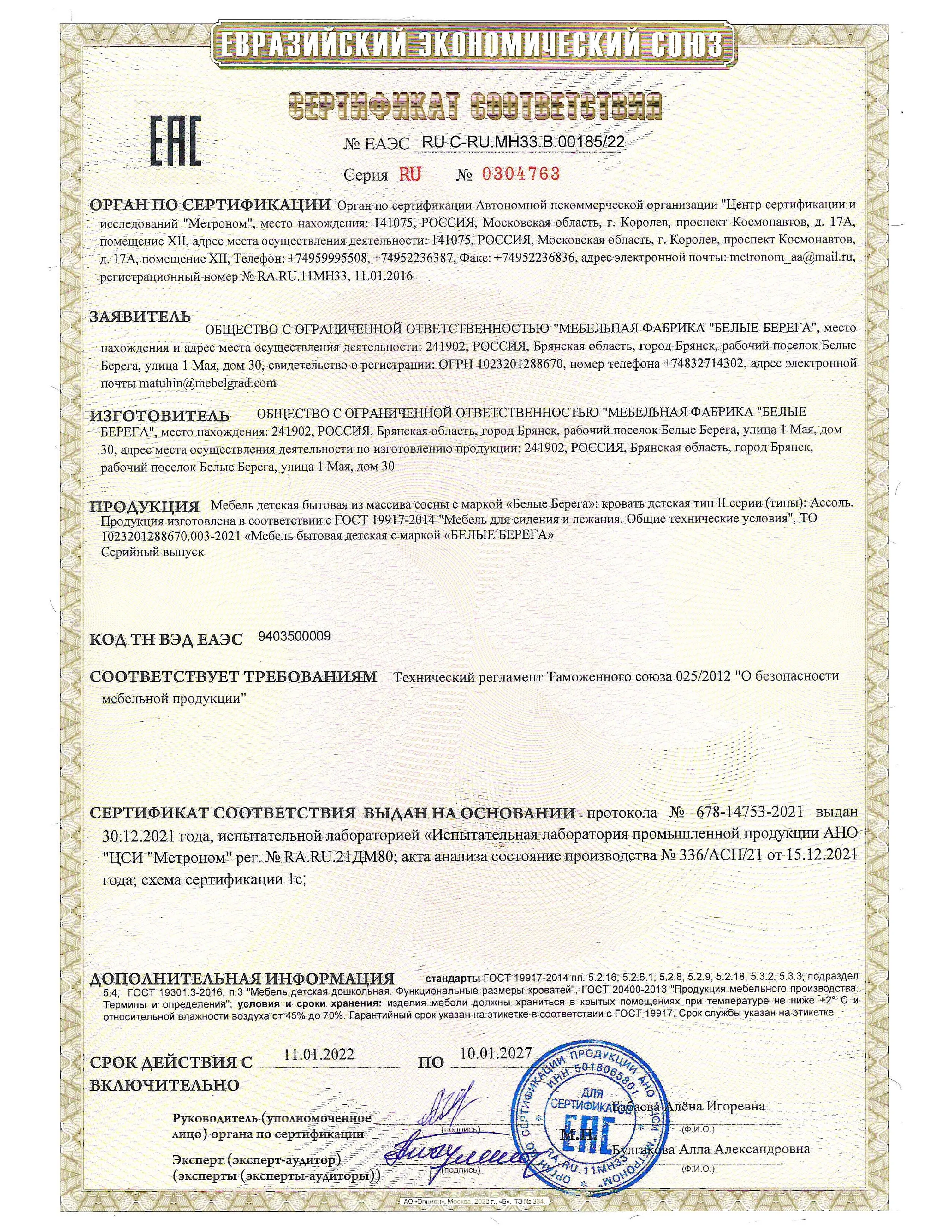 Ассоль - сертификат 10-01-2027