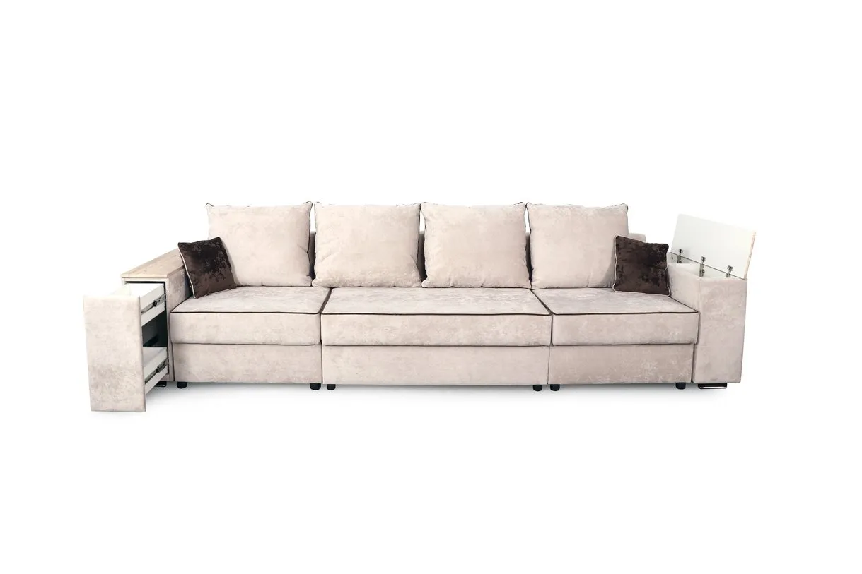 С одной стороны расположена боковина с нишей, с другой – ящики. Надежные петли с доводчиками добавляют комфортности использования мебели. Диван-трансформер может быть прямым, угловым и П-образным. Малые декоративные подушки входят в комплект дивана.