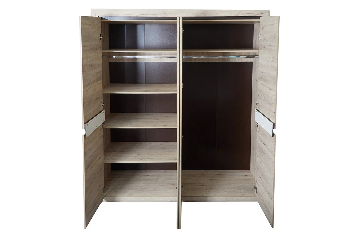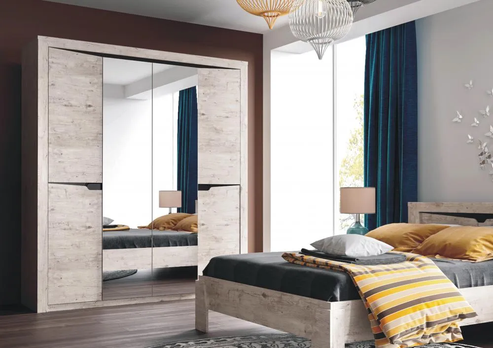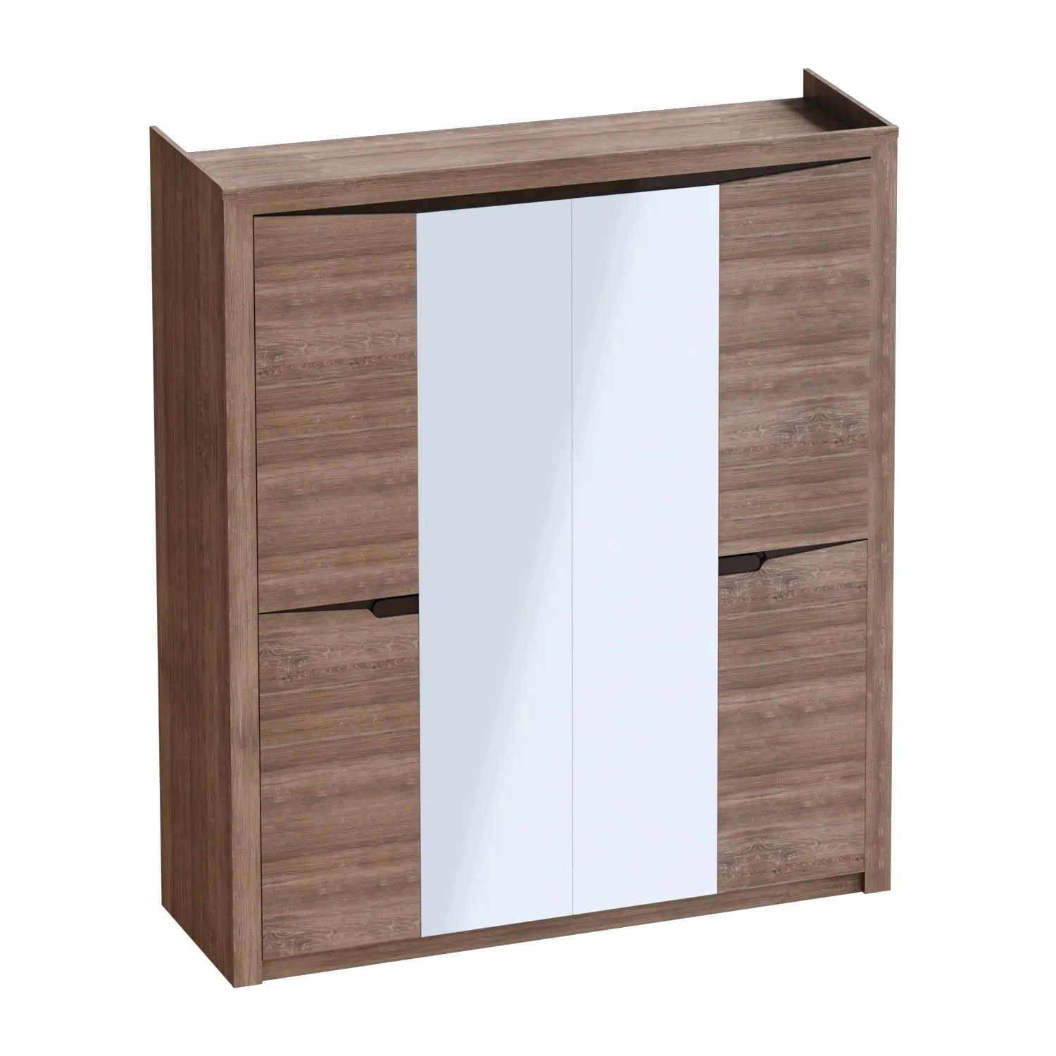 Четырёхдверный шкаф "Соренто" с зеркалом отлично подойдёт для спальни или прихожей и станет прекрасным дополнением к вашему интерьеру. На боковых дверях имеются декоративные вырезы, выполняющие функцию ручек. Одно из отделений шкафа можно изменить комплектом из трёх полок (приобретается отдельно).